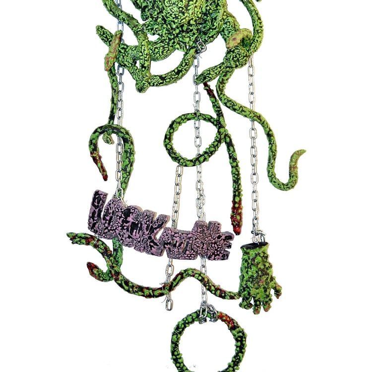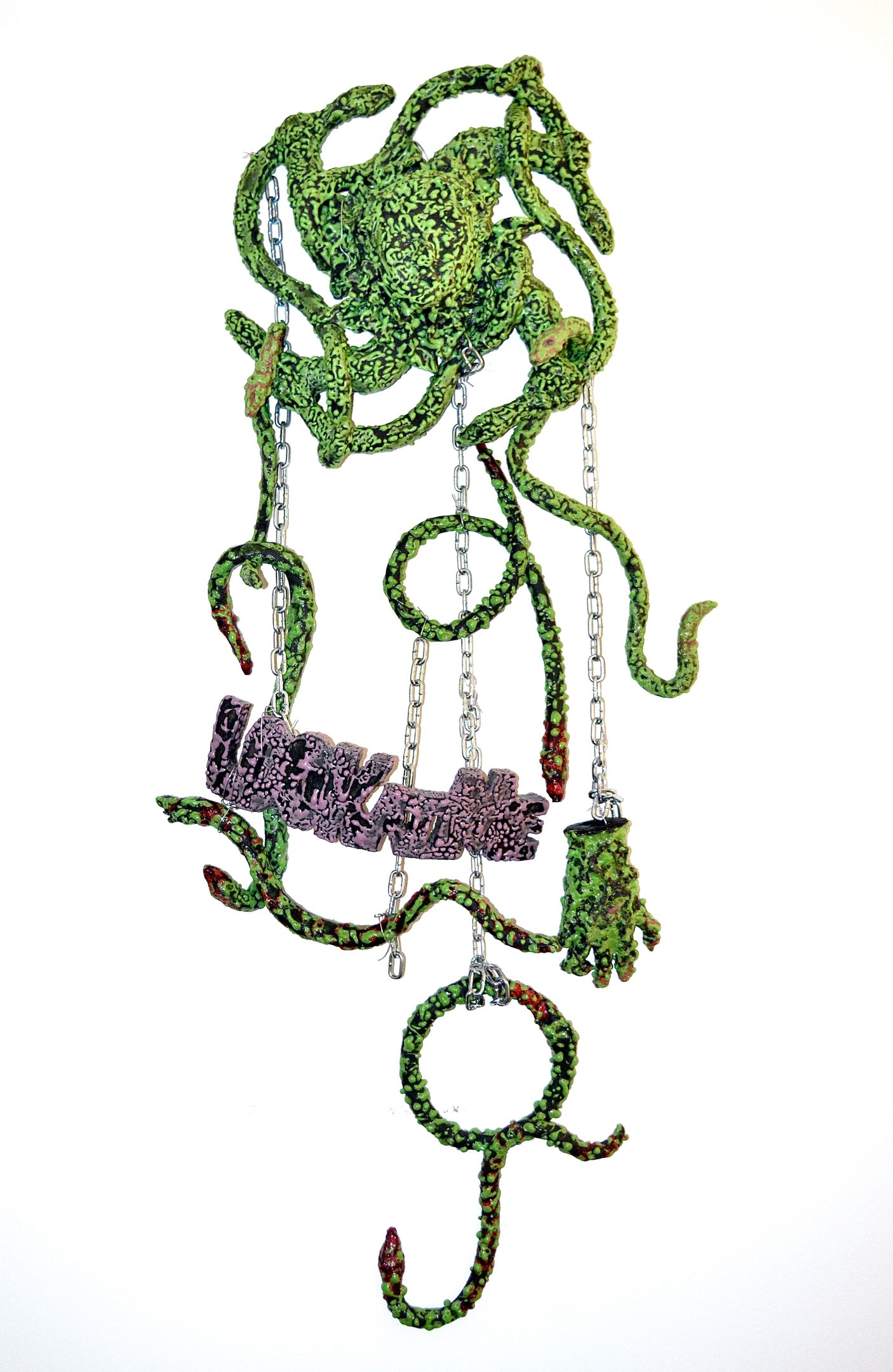 Ceramic, stoneware, special effect glazes, metallic chains, wire